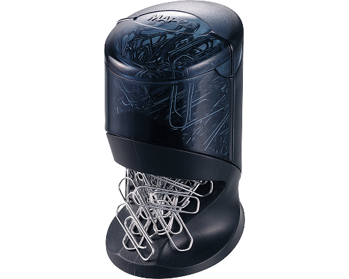 Dispencer per fermagli caratterizzato dalla facile erogazione dei fermagli. Base in alluminio. Magazzino trasparente, capacita 100 fermagli circa.